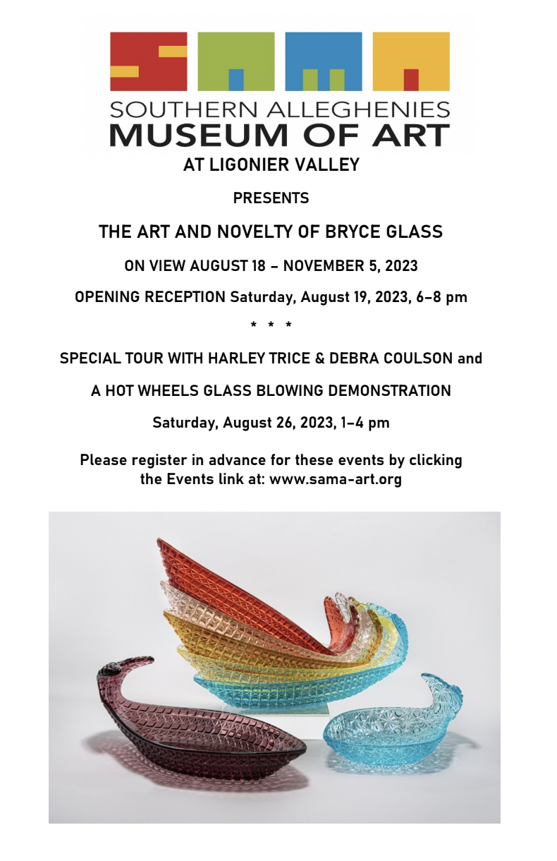An exhibition of Bryce glassware was featured at the Southern Alleghenies Museum of Art at Ligonier Valley, Pennsylvania, from August 18 through November 5, 2023.